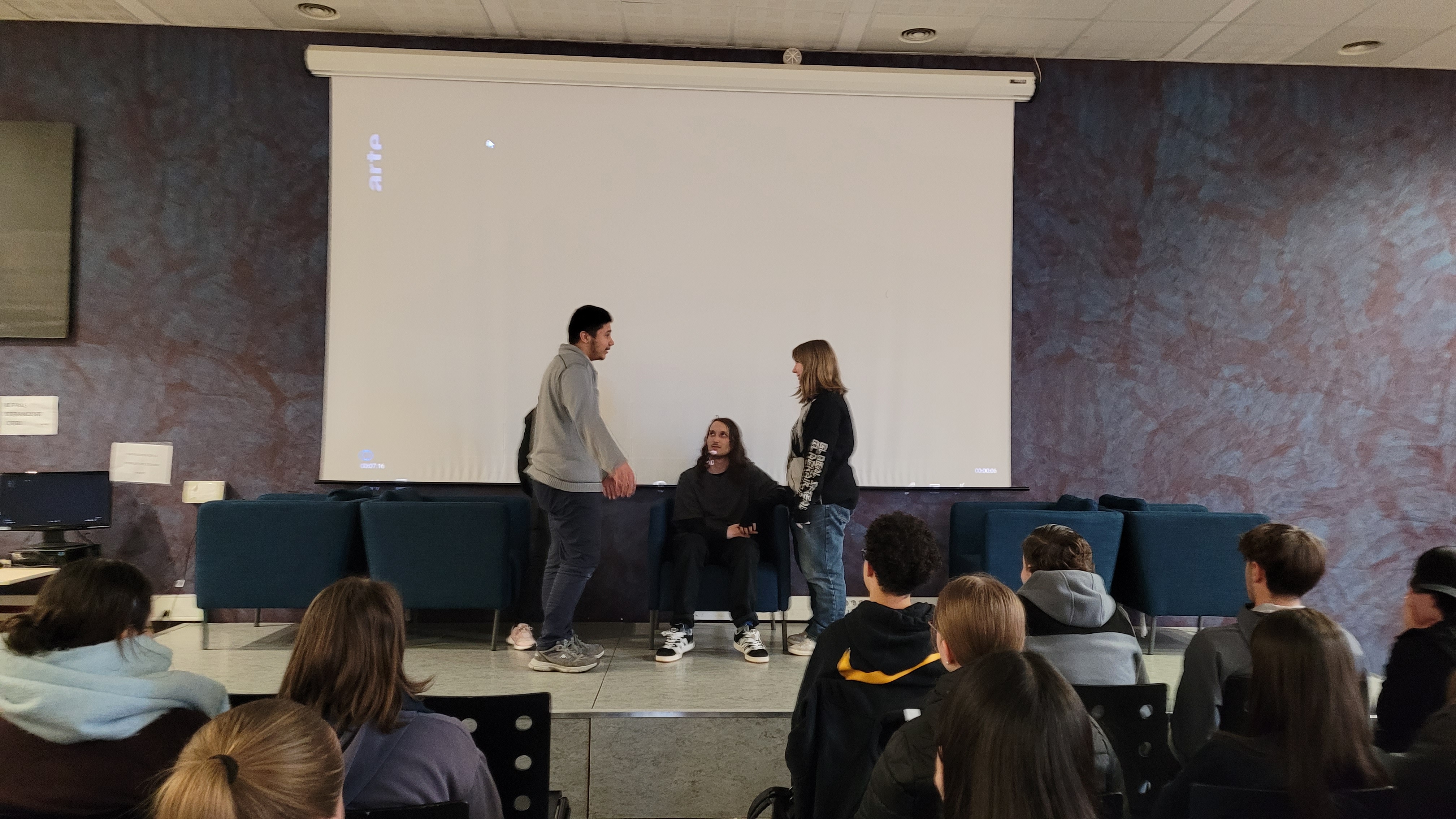 Dans un second temps, les élèves du théâtre d’improvisation, dirigé par Mme Renault, professeure documentaliste, ont présenté une saynète sous la forme d’un théâtre forum. Cette mise en situation a suscité de nombreuses réactions et a permis aux élèves de réfléchir collectivement aux comportements à adopter face à des situations problématiques rencontrées en ligne.